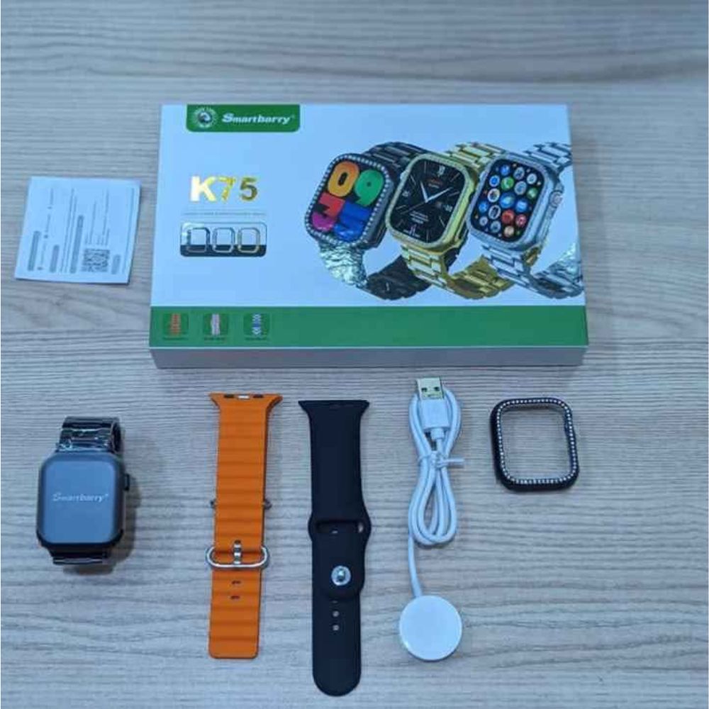 | 🎁 Contenu | Montre Smartbarry K75 – 3 bracelets interchangeables (acier + silicone) – Étui diamanté amovible – Câble de charge magnétique – Manuel d’utilisation |